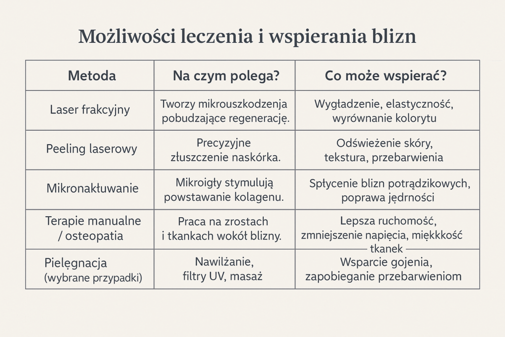 Laseroterapia jest jedną z metod stosowanych w poprawie wyglądu blizn — pourazowych, potrądzikowych czy pooperacyjnych. Wykorzystuje najczęściej frakcyjne źródła światła, które tworzą mikrouszkodzenia skóry, inicjując procesy regeneracyjne.